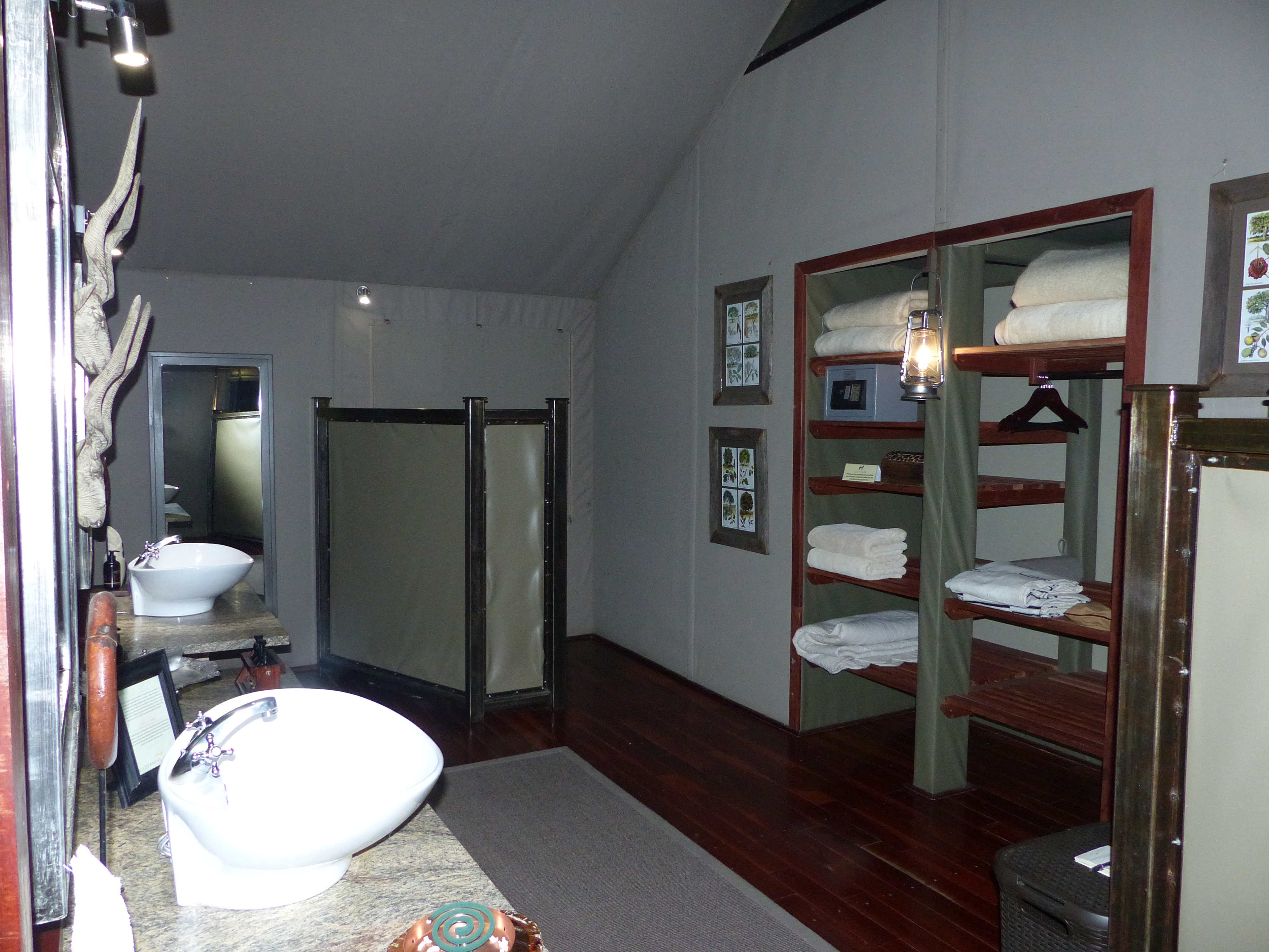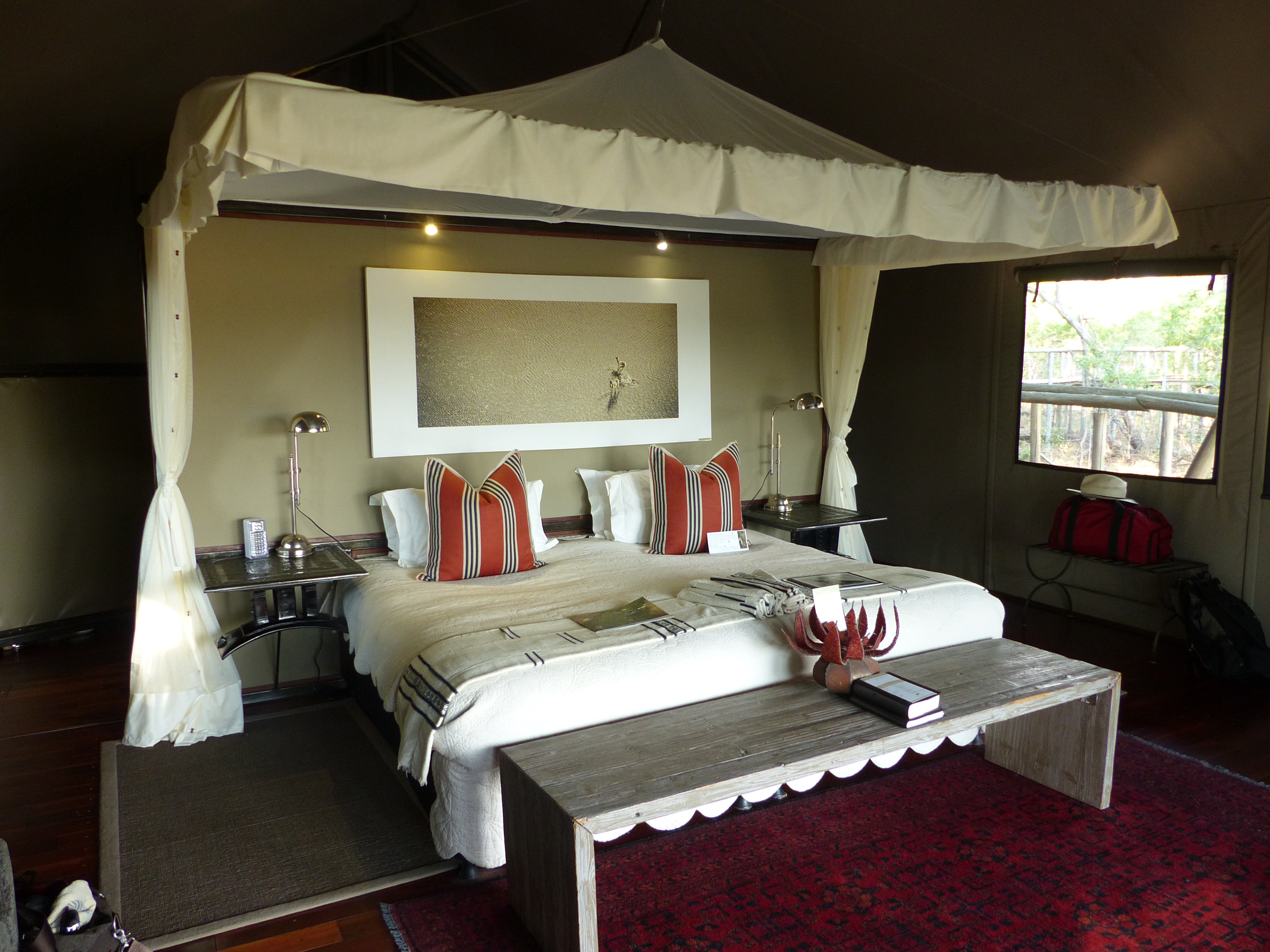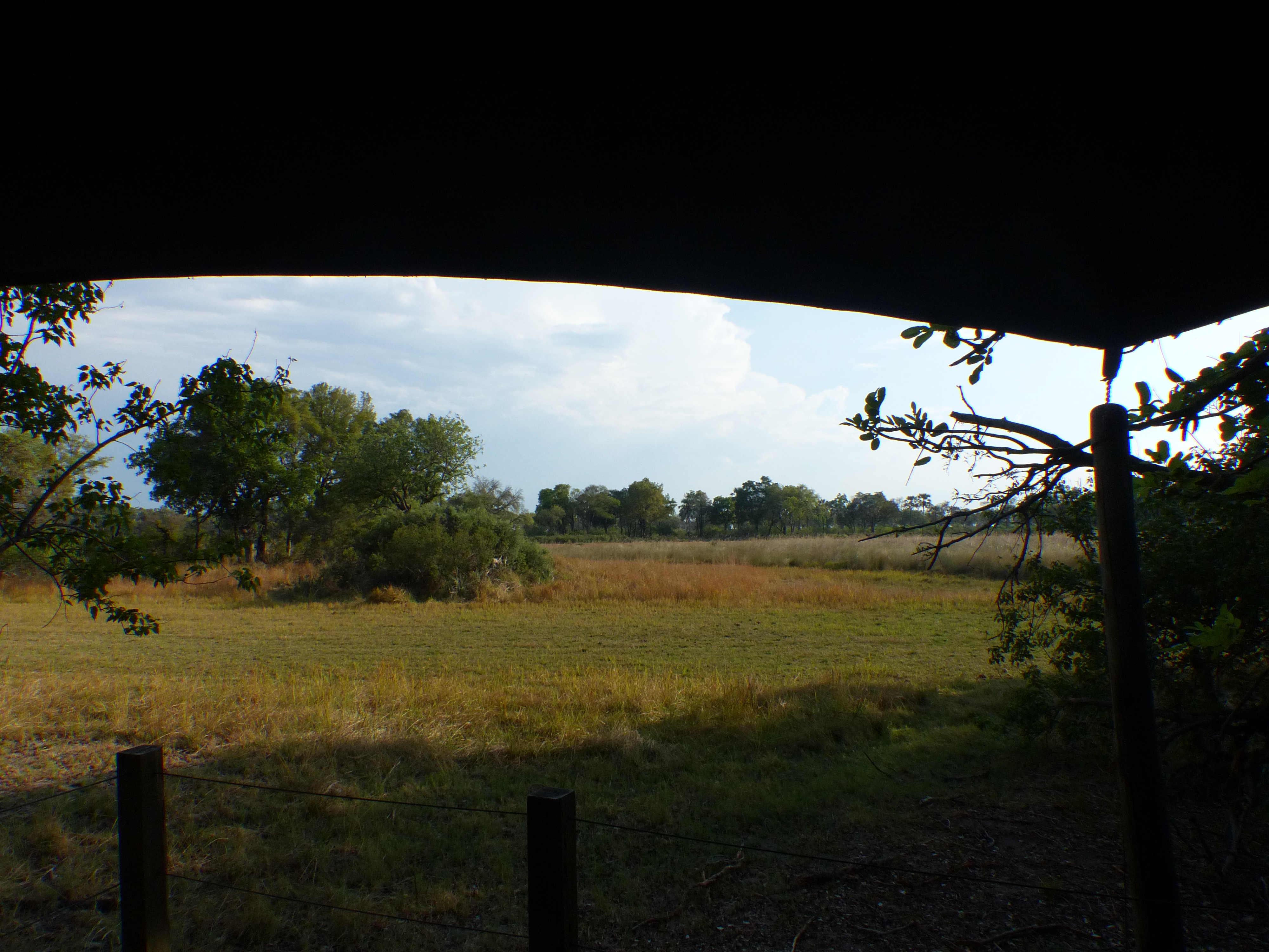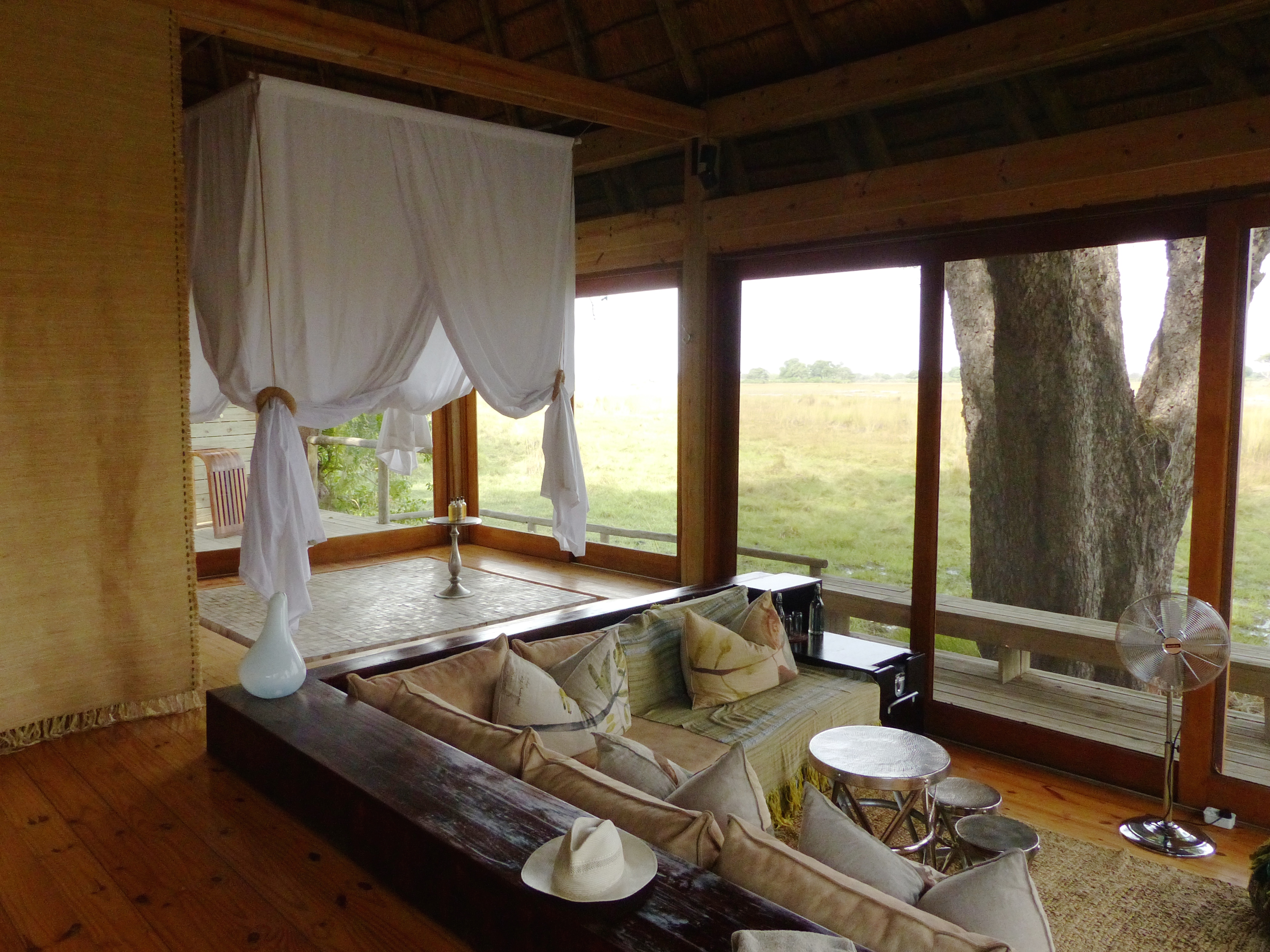 Life at Vumbura Plains was pretty plush. There were lots of little touches that contributed. When we first arrived, we were asked during our orientation what drinks we preferred for sundowners. We said gin and tonic, please. Then they asked what sort of gin we’d like! Upon returning from each game drive we were greeted with a cool or warm (depending on the weather), moist, scented towel to wipe the dust from our faces and hands. The service was excellent. The kitchen produced delicious food and we enjoyed having some of our dinners and all of our lunches at private tables. Meals were less time structured than at Chitabe, which was relaxing. They had some delicious house roasted nuts at sundowners which we also found in the mini-bar in our room. In an effort to be more sustainable and cut down on the use of disposable plastic water bottles, Wilderness Safaris gives each guest a stainless steel water bottle to use during their stay, and of course to take home as a souvenir. As at Chitabe, all the buildings and walkways were raised off the ground, and the common areas looked out over the watery plain. The guest bathroom near the “lobby” also faced the view, which you could see quite easily from the throne since there was no wall on that side! The wildlife was everywhere. While being escorted after dark back to our room to freshen up for dinner one evening, our flashlights lit up a hippo grazing in the grass just below us. At night the sounds of the bush were everywhere, including right outside our tent.
