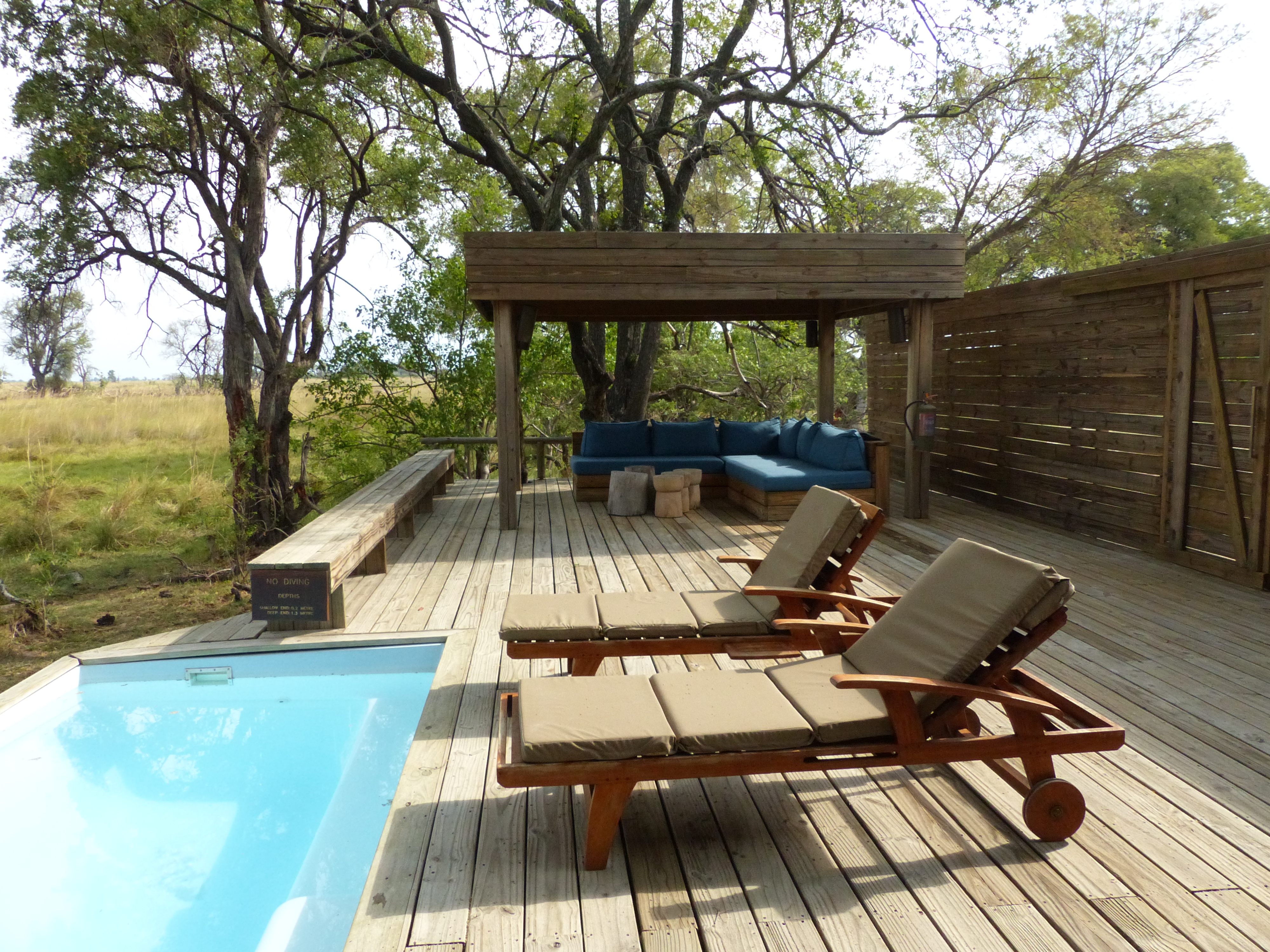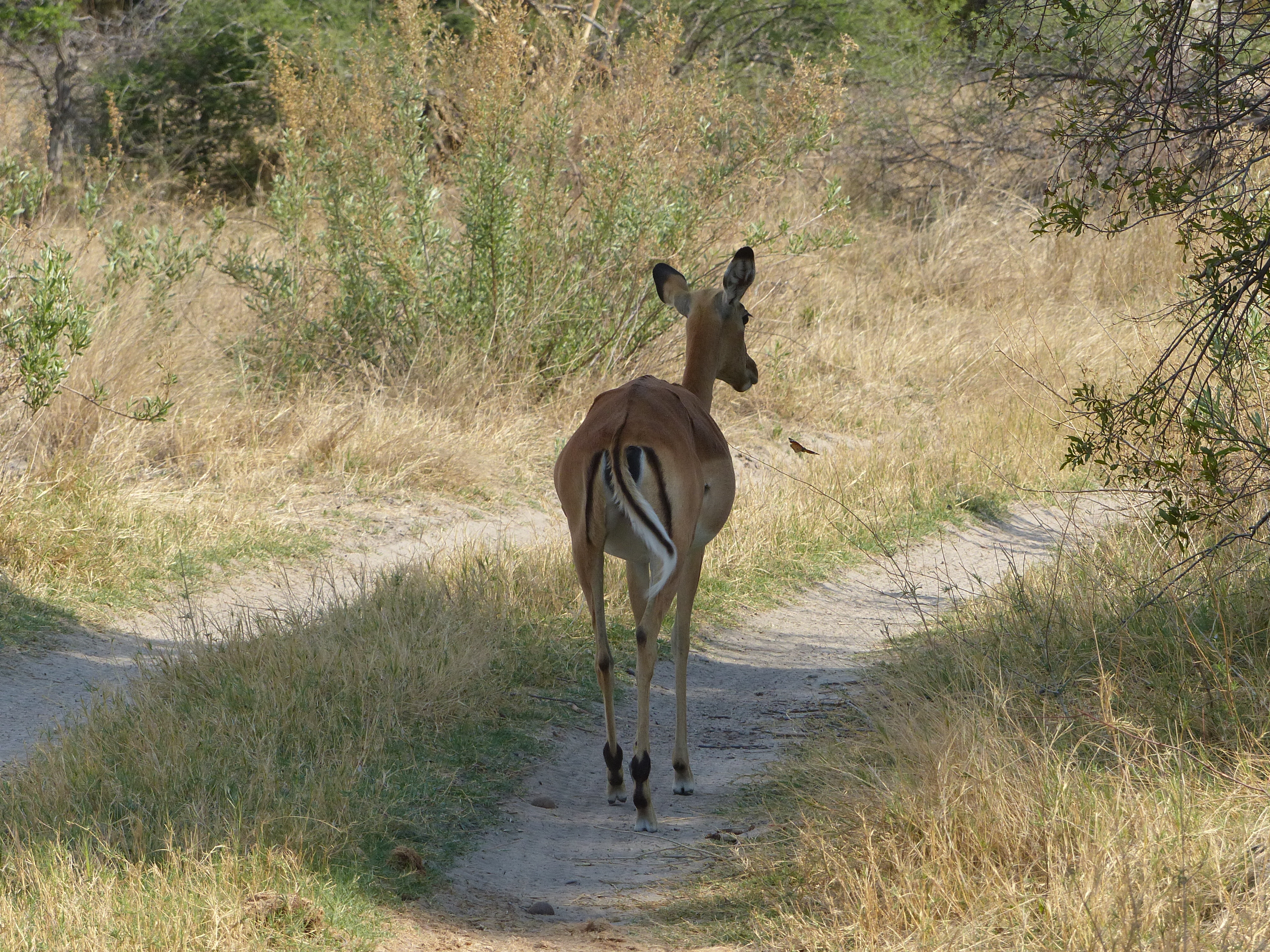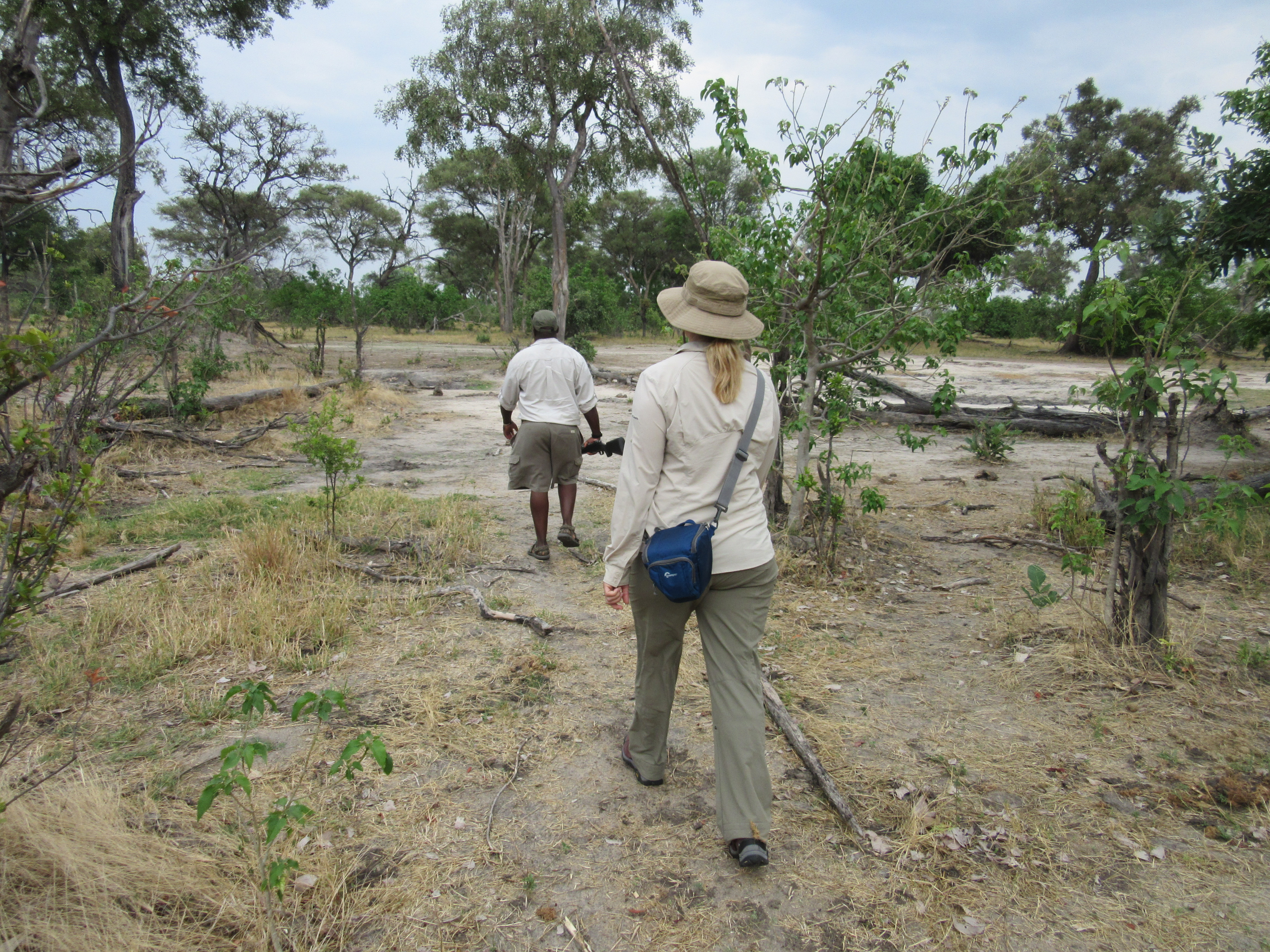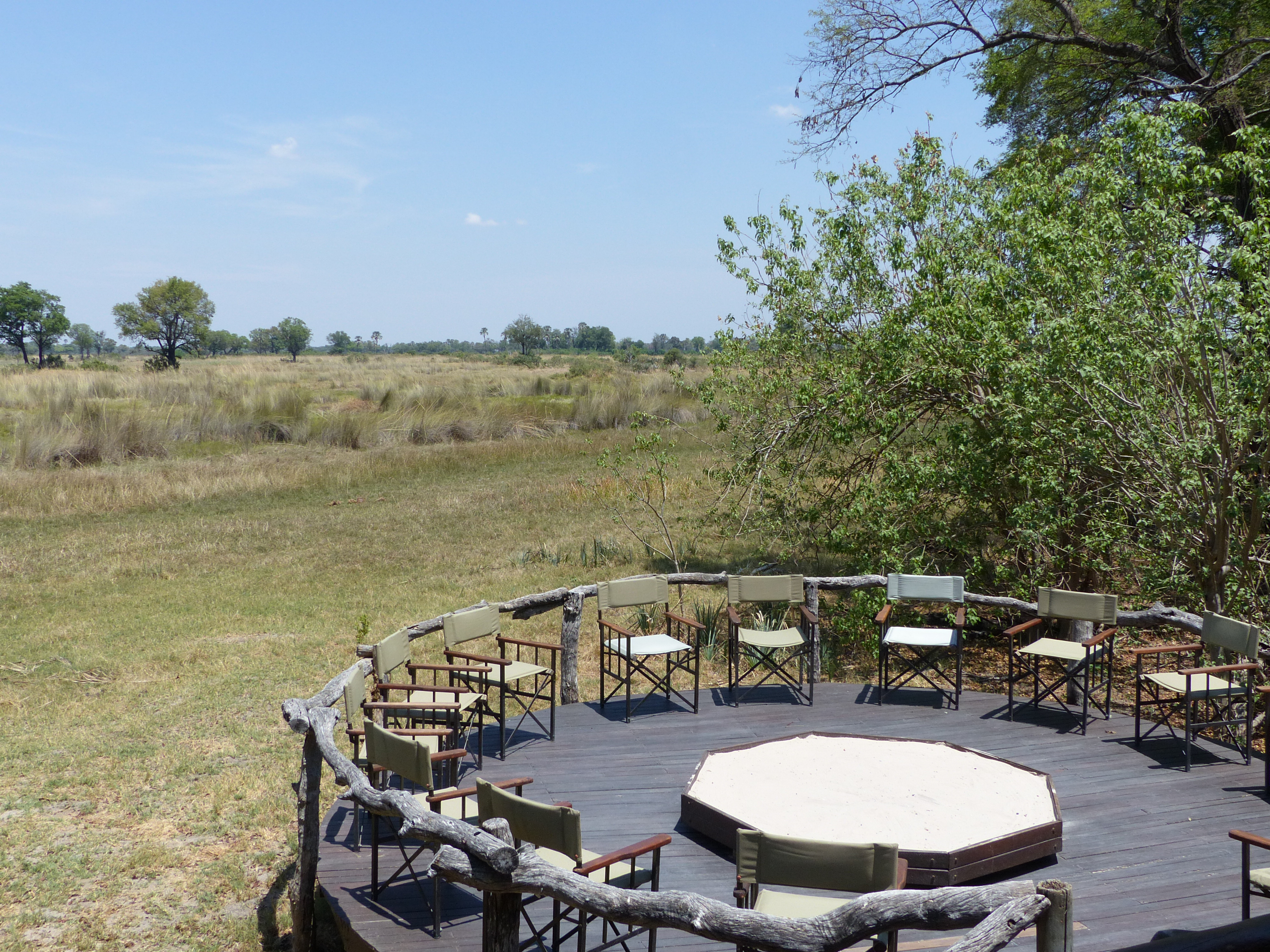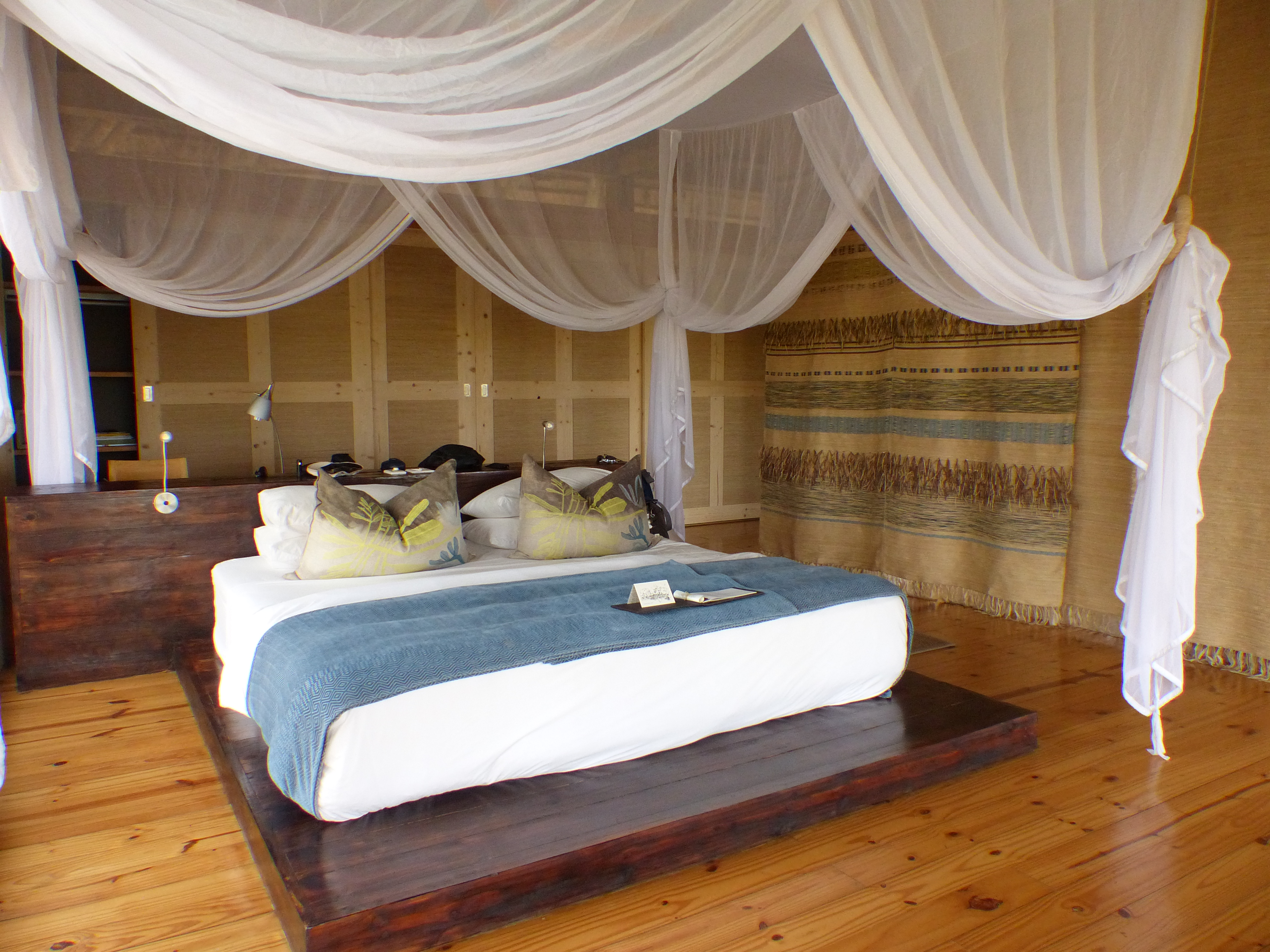 Life at Vumbura Plains was pretty plush. There were lots of little touches that contributed. When we first arrived, we were asked during our orientation what drinks we preferred for sundowners. We said gin and tonic, please. Then they asked what sort of gin we’d like! Upon returning from each game drive we were greeted with a cool or warm (depending on the weather), moist, scented towel to wipe the dust from our faces and hands. The service was excellent. The kitchen produced delicious food and we enjoyed having some of our dinners and all of our lunches at private tables. Meals were less time structured than at Chitabe, which was relaxing. They had some delicious house roasted nuts at sundowners which we also found in the mini-bar in our room. In an effort to be more sustainable and cut down on the use of disposable plastic water bottles, Wilderness Safaris gives each guest a stainless steel water bottle to use during their stay, and of course to take home as a souvenir. As at Chitabe, all the buildings and walkways were raised off the ground, and the common areas looked out over the watery plain. The guest bathroom near the “lobby” also faced the view, which you could see quite easily from the throne since there was no wall on that side! The wildlife was everywhere. While being escorted after dark back to our room to freshen up for dinner one evening, our flashlights lit up a hippo grazing in the grass just below us. At night the sounds of the bush were everywhere, including right outside our tent.