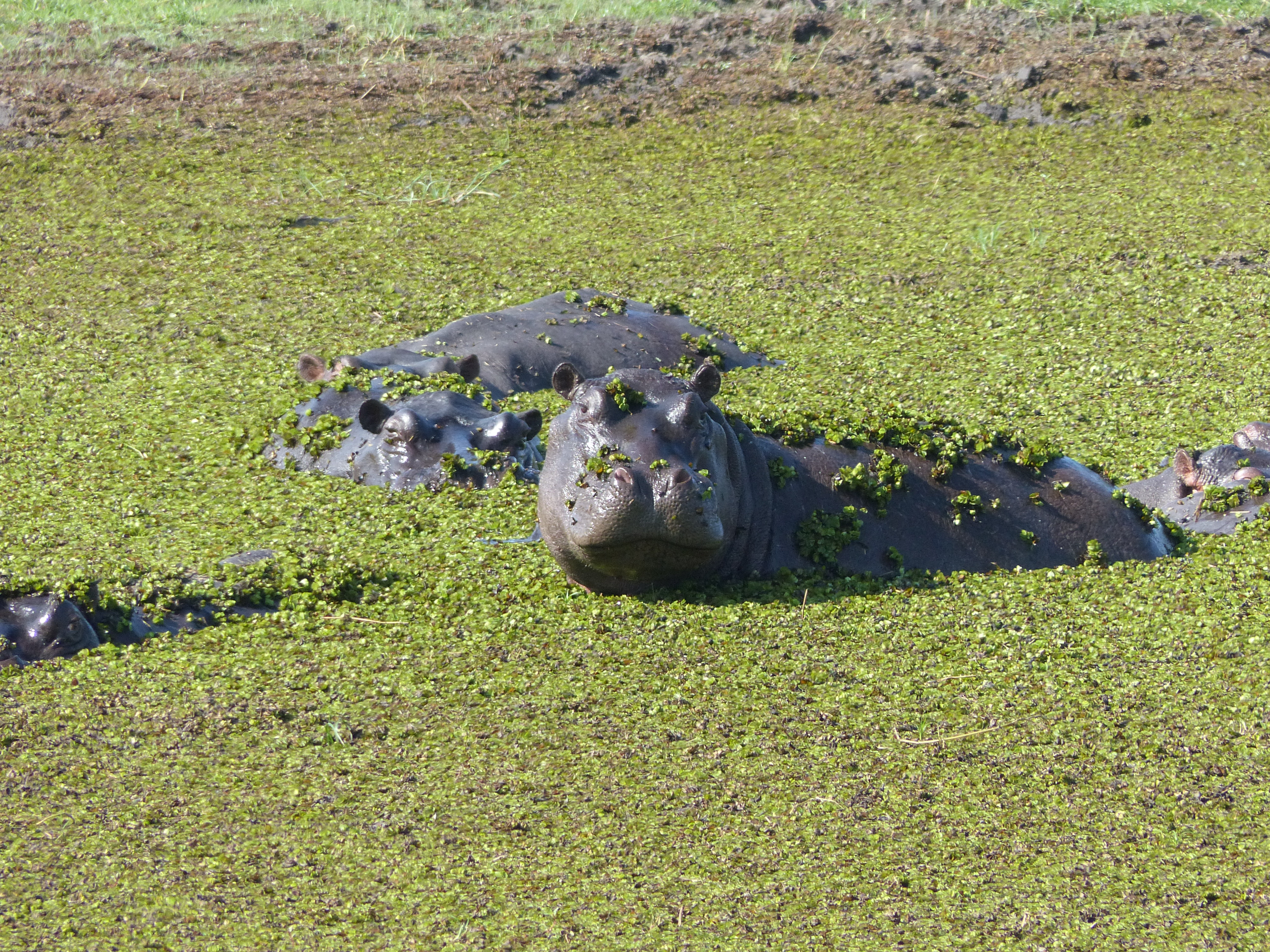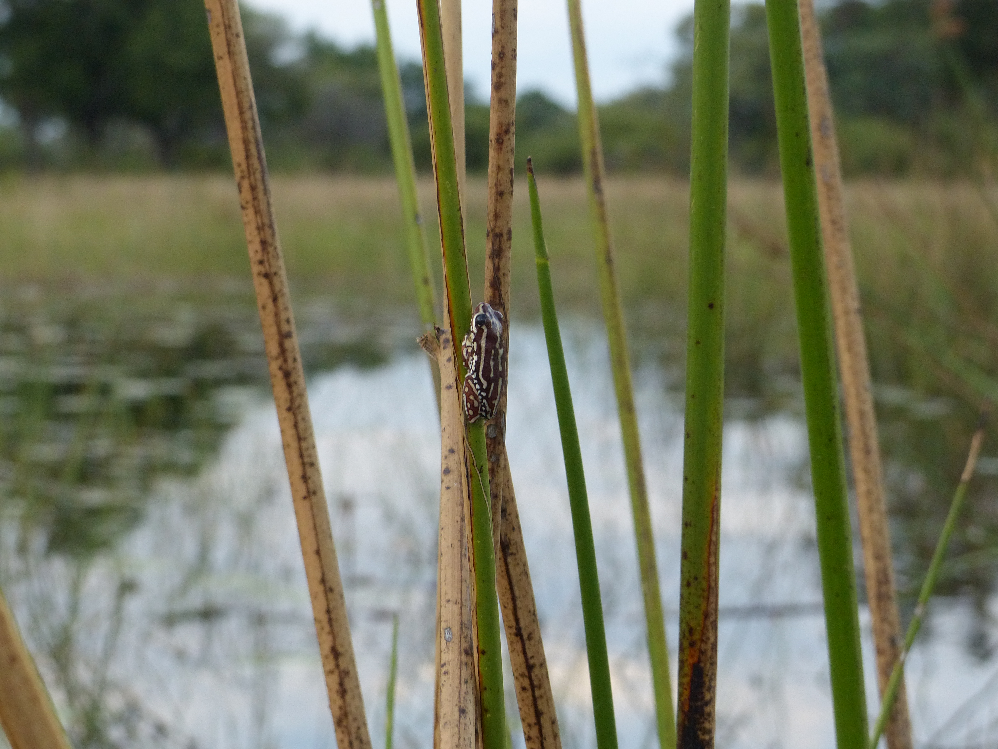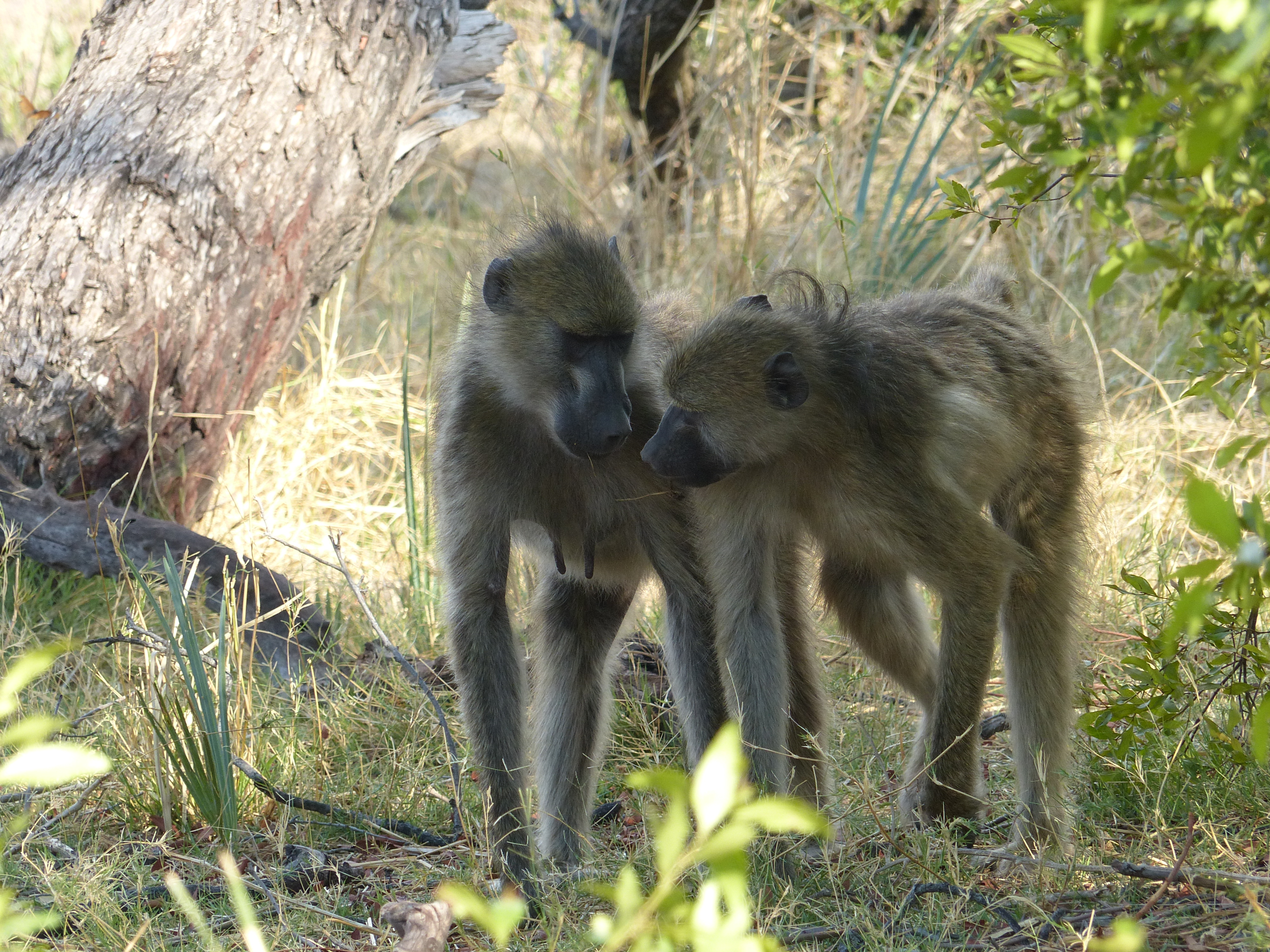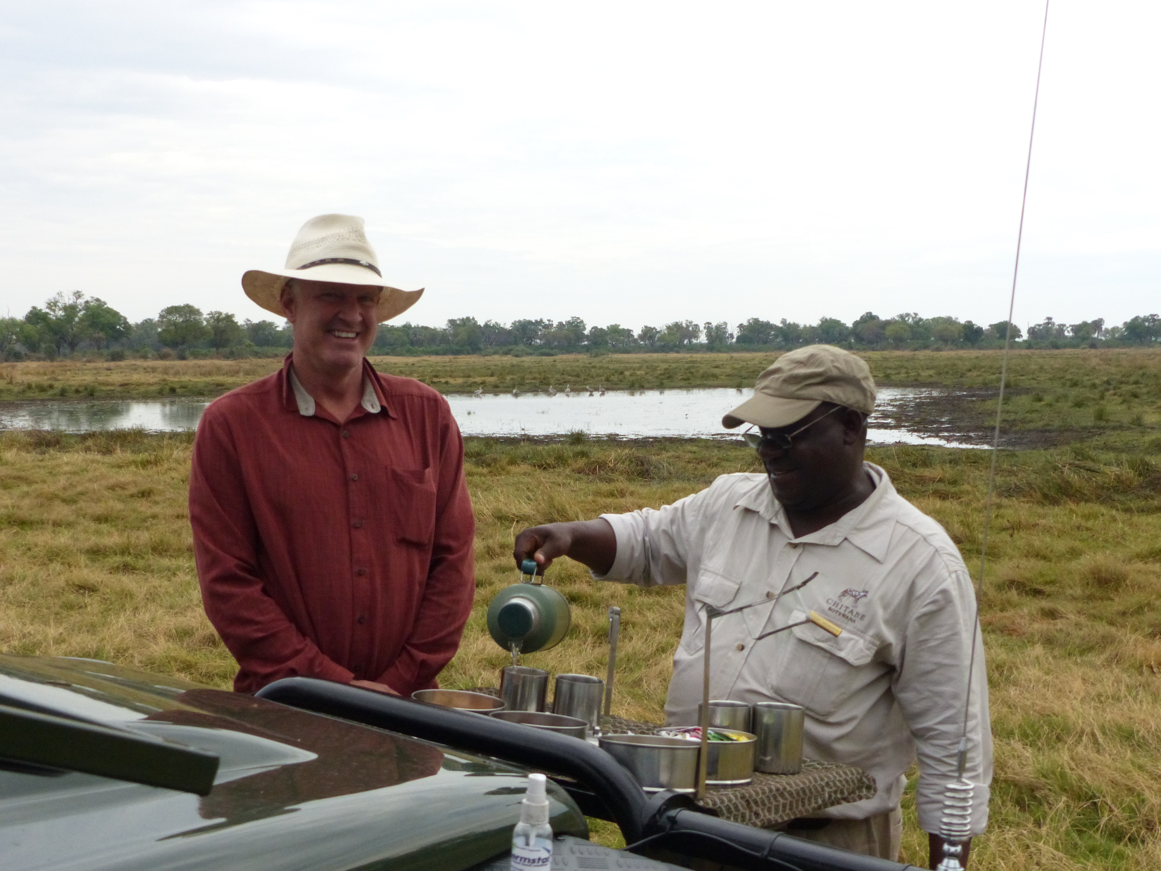 Life at Vumbura Plains was pretty plush. There were lots of little touches that contributed. When we first arrived, we were asked during our orientation what drinks we preferred for sundowners. We said gin and tonic, please. Then they asked what sort of gin we’d like! Upon returning from each game drive we were greeted with a cool or warm (depending on the weather), moist, scented towel to wipe the dust from our faces and hands. The service was excellent. The kitchen produced delicious food and we enjoyed having some of our dinners and all of our lunches at private tables. Meals were less time structured than at Chitabe, which was relaxing. They had some delicious house roasted nuts at sundowners which we also found in the mini-bar in our room. In an effort to be more sustainable and cut down on the use of disposable plastic water bottles, Wilderness Safaris gives each guest a stainless steel water bottle to use during their stay, and of course to take home as a souvenir. As at Chitabe, all the buildings and walkways were raised off the ground, and the common areas looked out over the watery plain. The guest bathroom near the “lobby” also faced the view, which you could see quite easily from the throne since there was no wall on that side! The wildlife was everywhere. While being escorted after dark back to our room to freshen up for dinner one evening, our flashlights lit up a hippo grazing in the grass just below us. At night the sounds of the bush were everywhere, including right outside our tent.