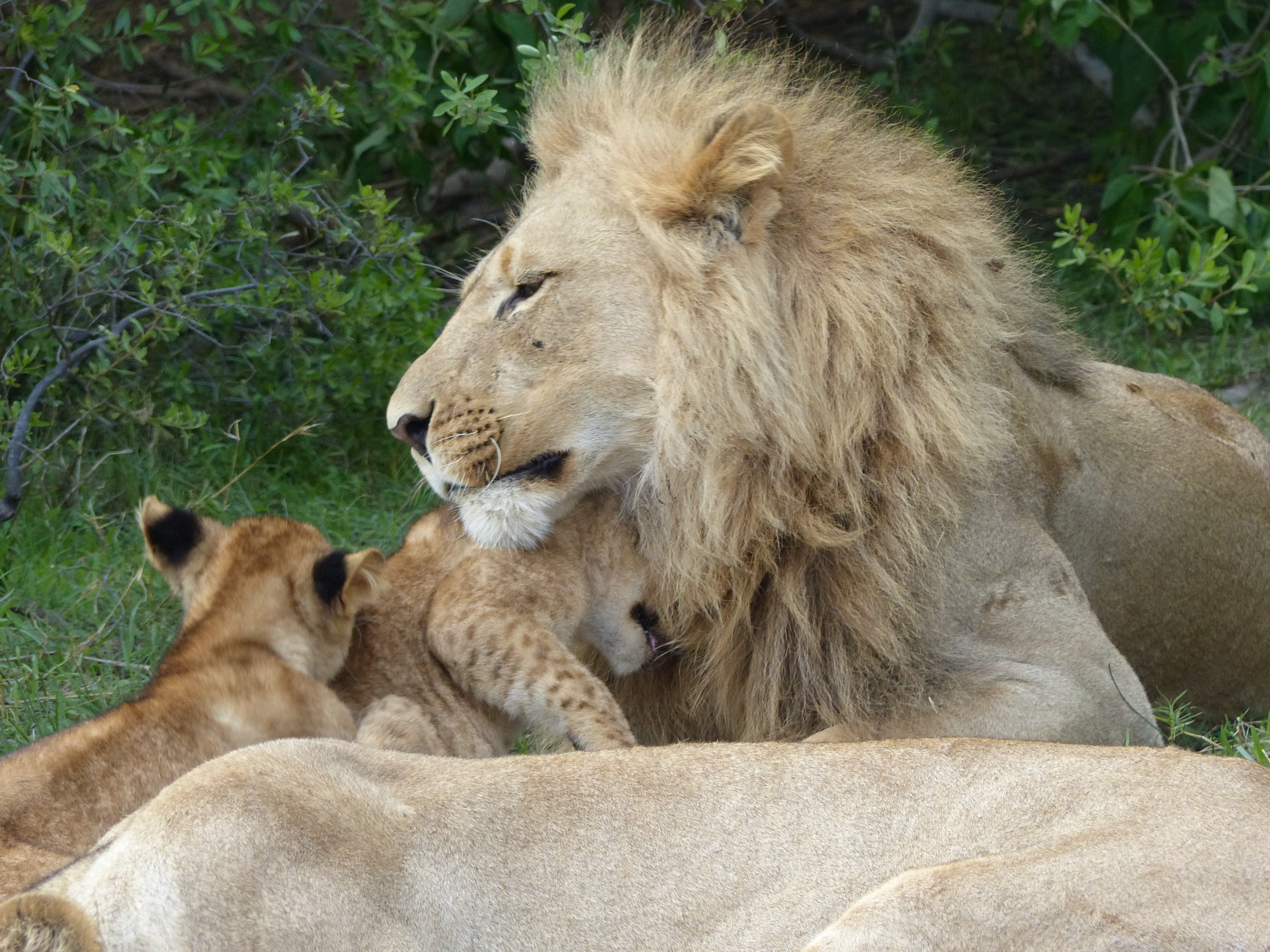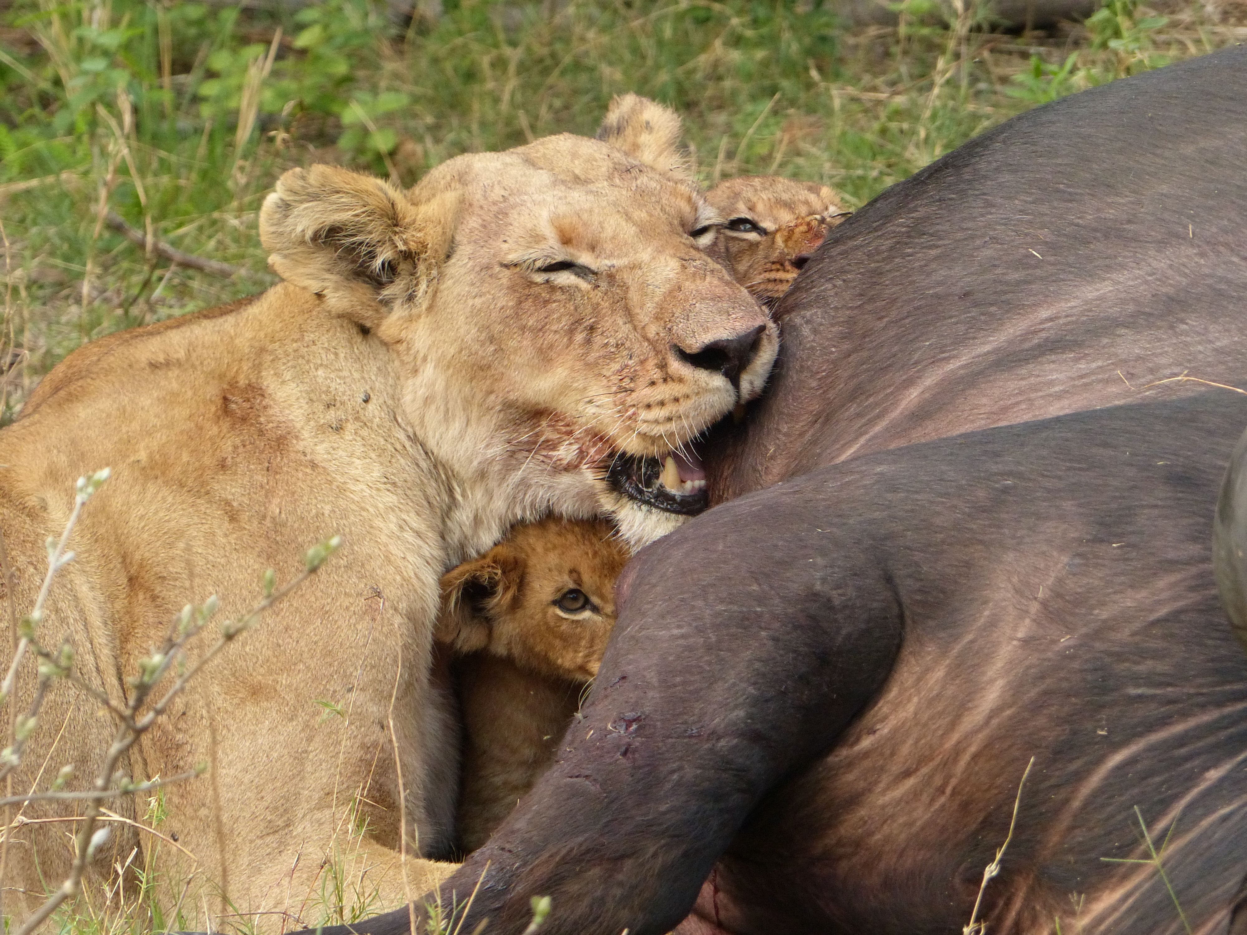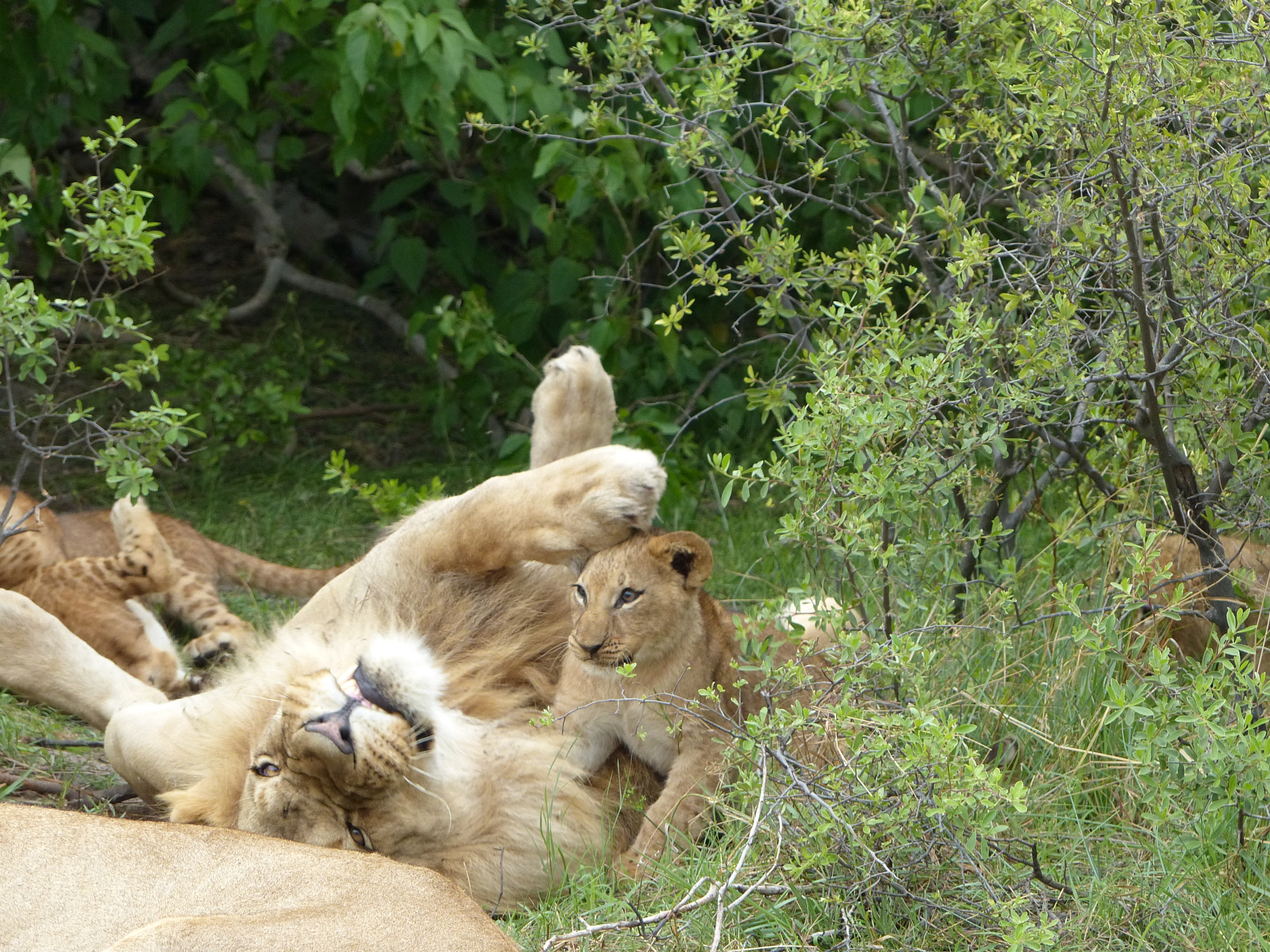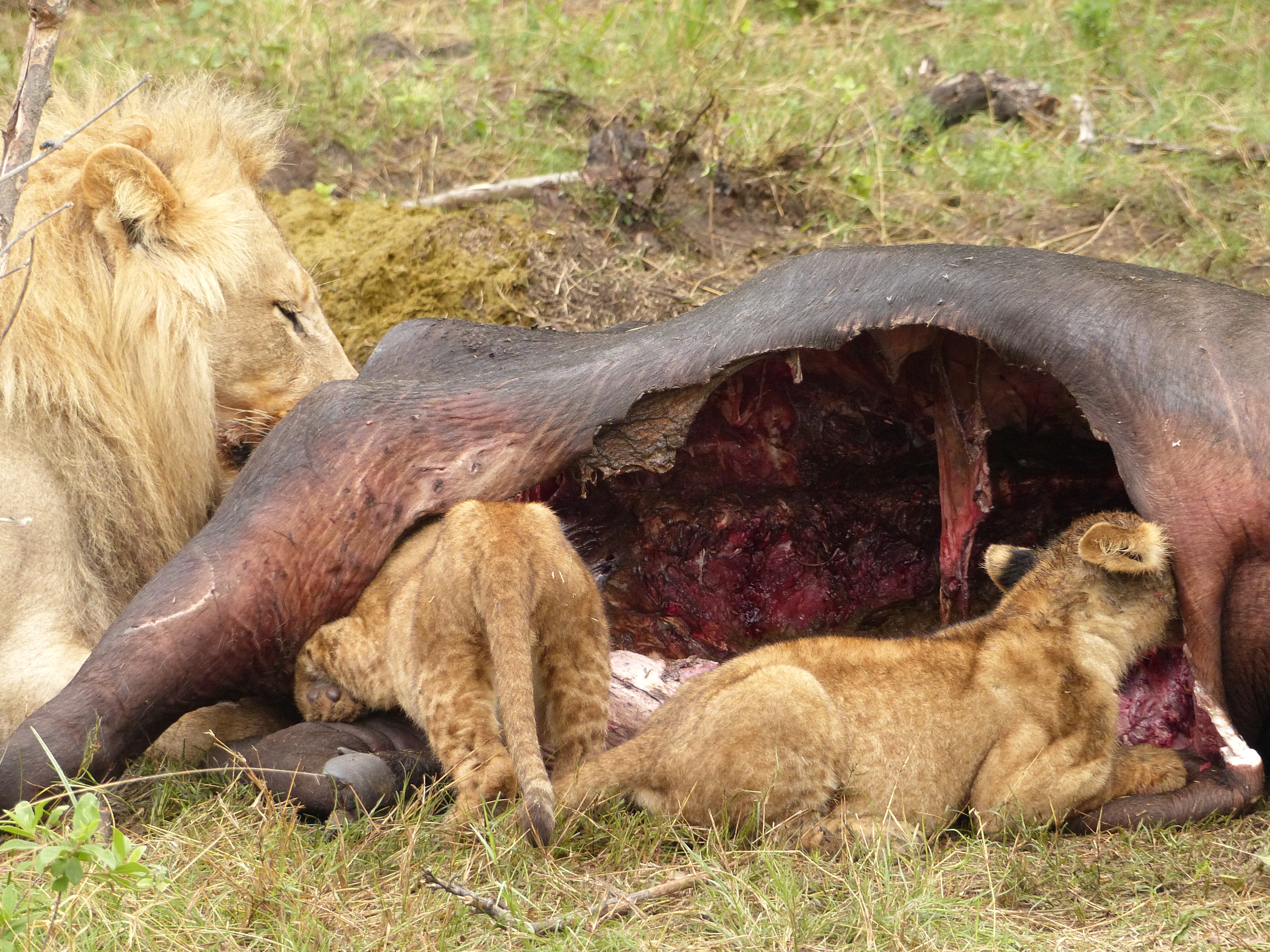 On our last visit to see the lion family with their buffalo kill we saw them lounging and playing in a very peaceful scene. The cubs were so playful and tried to engage their uncle, who was really quite patient with them.
