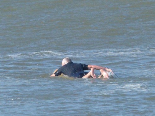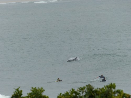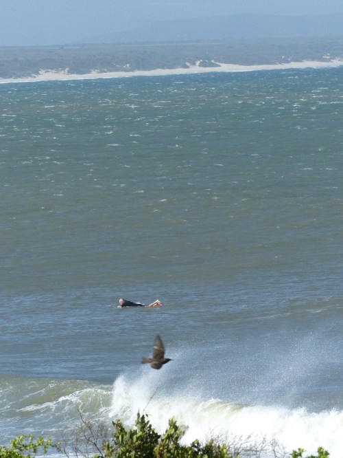Michael and Glenn discussed the surf which was, coincidentally, quite good. This is not the season for good surf in Jeffrey's Bay but Michael was in luck. The winds had been onshore for two weeks before we got there, producing no good surfing conditions, but they had just changed. After settling in, we went in search of a surfboard for Michael to rent so he could surf. After checking a couple of local shops and grabbing a bite for lunch, we found a suitable board and went back to our shangri-la. Michael eagerly donned the spring wetsuit he had brought with him and went out to surf. It was really fun for me to be able to watch him easily from our deck, sometimes assisted by the binoculars or my camera.