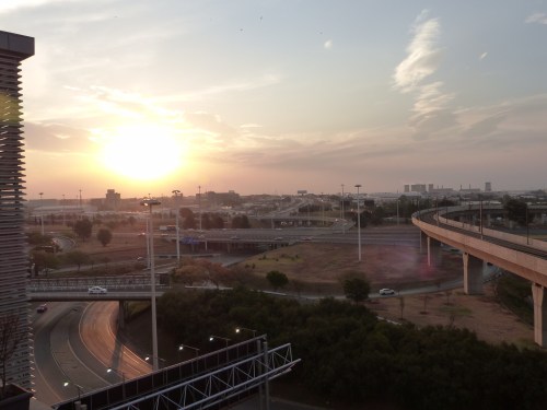 Customs and Immigration and retrieving our luggage was easy. In fact we were surprised that there was virtually no customs check. Although we saw an agricultural inspection station, nobody stopped us, asked us any questions, or even batted an eye at us as we sailed past one sign saying “Nothing to Declare”. There weren't even any forms to fill out on the airplane as there are for many other countries. Once we were in the main terminal our first stop was the Vodacom store to pick up my pre-ordered sims for iPhone and iPad. This too was quick and easy. Next up was finding the hotel. Although it was a bit of a walk, we had a cart and some good directions from the information kiosk personnel. The City Lodge Hotel was a good choice. Easy access to the airport, clean rooms, and a nice breakfast buffet. After a much appreciated shower and some re-packing, Michael and I took our extra luggage back to the terminal to store at Bagport while we are on safari. First we had the pieces shrink wrapped as was recommended to combat possible theft or smuggling. Then we found an ATM for some more cash and a restaurant for a hot meal. The restaurant made us giggle as it was called Spur's and was Native American themed. We came all the way from the REAL home of Native Americans to go to a restaurant that touted “the secret tribe”. Ha Ha! Nevertheless, the hamburger tasted good as did the glass of red wine. With our bellies full and starting to feel the effects of our long journey, we made our way back to the room and tumbled into bed for what we hoped would be a good night's sleep. Here's a shot of the view from our room when we arrived at sunset, showing highways and what looks like a nuclear power plant in the distance.
