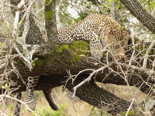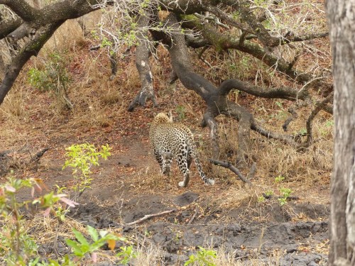 One of our leopard sightings was a beautiful female lounging in a tree. The light was decent for once, at least until she turned the other way! After watching her for a bit we got to see her climb down the tree and go hide in the bushes. An approaching troupe of baboons was the cause. You would think a leopard in a tree would not have reason to fear a few baboons, but in reality, she was in grave danger as they could easily have overcome her. Baboons can be fierce aggressors and a lone leopard is wise to seek cover. Here are some photos of that gorgeous lady.