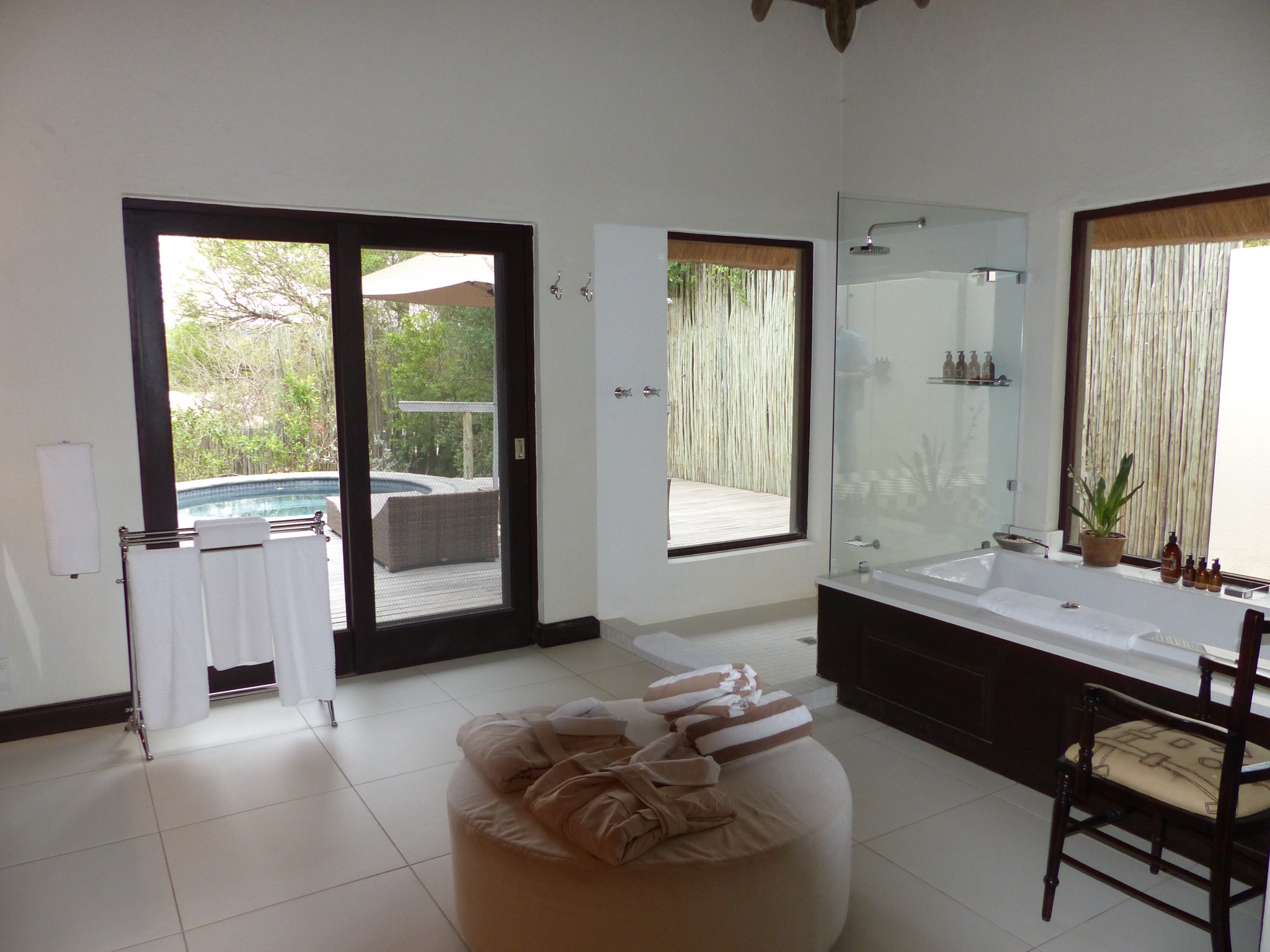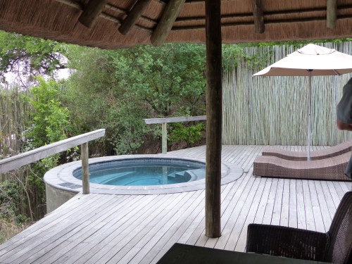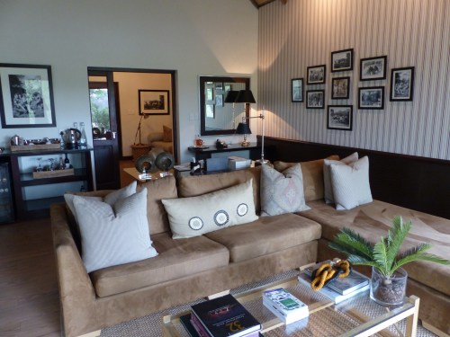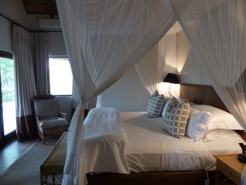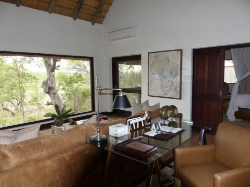 We were shown to our cottage by Cavin who will be taking care of us in the dining and bar area for meals and drinks etc. Londolozi has five camps strung out along the Sand River. It’s one of the oldest private reserves in South Africa and was founded in 1926. A ferociously dedicated family run outfit, it serves as a model for other lodges and reserves. Pioneer Camp has only 3 suites and is either a very private setting for couples or can be taken altogether as a terrific family or group lodge. At the moment there are only five of us staying here. Loraine and Allan have one of the other suites and the third is occupied by a single American woman. This makes for a very intimate atmosphere. One of the things that sets Londolozi apart is the personal nature of the experience and the incredible level of service, not to mention the beautiful setting. You will never feel crowded at an animal sighting here and there is an amazing variety of abundant wildlife. Here are a few pictures of our stupendous suite which features an entryway, living area, beautiful bedroom with mosquito netted bed, and enormous bathroom. There is also a large deck with a plunge pool and an outdoor shower. We have big picture windows and great views of the bush.