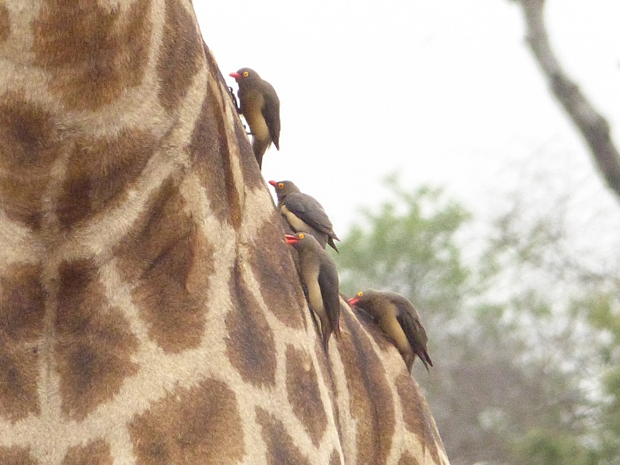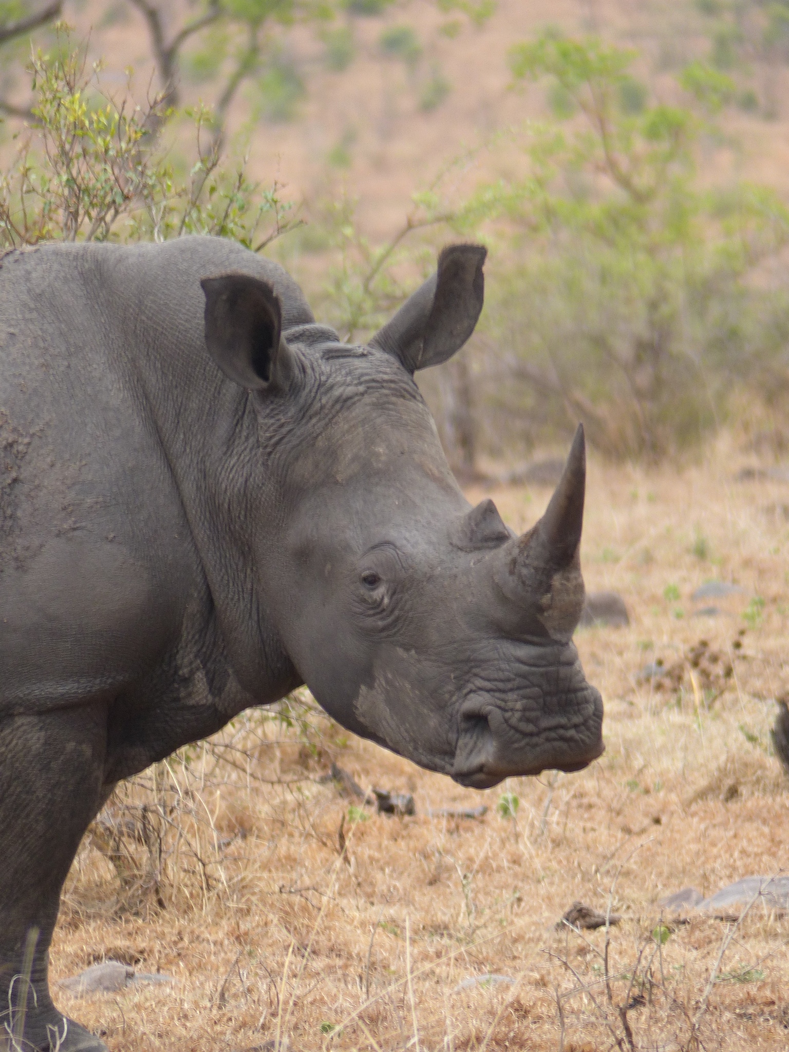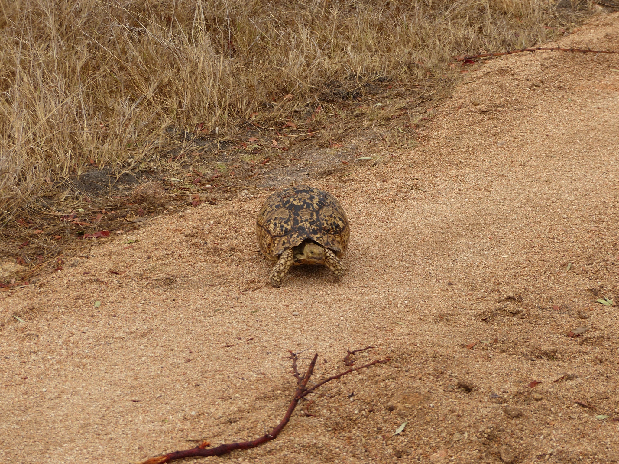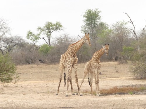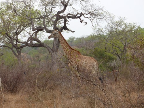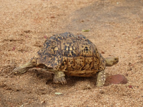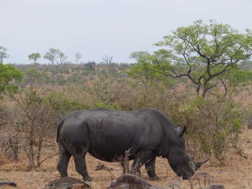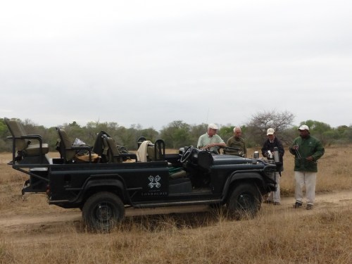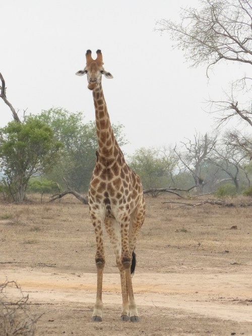 After dropping our bags in our suite and taking it all in, we returned to the main lodge area just adjacent to have lunch on the deck. How nice it was to finally relax a bit! After lunch we did some unpacking and then returned for afternoon tea in preparation for our first safari drive. We have found there is certainly no lack of fabulous food and drink here. One thing is for certain, we will never go hungry and most likely will be adding a few pounds if we’re not careful! Kate met us for tea and showed us maps of the reserve to give us an orientation. After an ice coffee for me and a gluten free mini cheesecake, it was time to be off. It was just the four of us with Kate and Life. We climbed into our Land Rover with comfortable, padded, elevated seats and were handed sturdy ponchos in defense of the possible rain. Life sits up front hanging just off the front of the hood in a special tracker’s seat and Kate drives. I’ll try to get a picture of Life’s perch later to show you. It has been much cooler here than I anticipated which, actually, is not unwelcome. I donned my own rain jacket almost immediately and not long after we all donned ponchos. It was drizzly off and on, but we never got seriously wet or were uncomfortable despite being out in the elements. Kate mentioned that a pack of wild dogs had been spotted earlier in the day and that we would head off in that general direction to see if they were active. Wild dogs are quite rare and although they have sometimes had a den site on the Londolozi reserve, this pack’s current den has been moved further off. So the prospect of seeing wild dogs was apparently an exciting one. I say apparently not because we didn’t consider it exciting, but more because as safari neophytes, we have no real frame of reference for how rare it is. Along the way in search of wild dogs we saw giraffe, a leopard tortoise and some white rhino, along with countless birds.